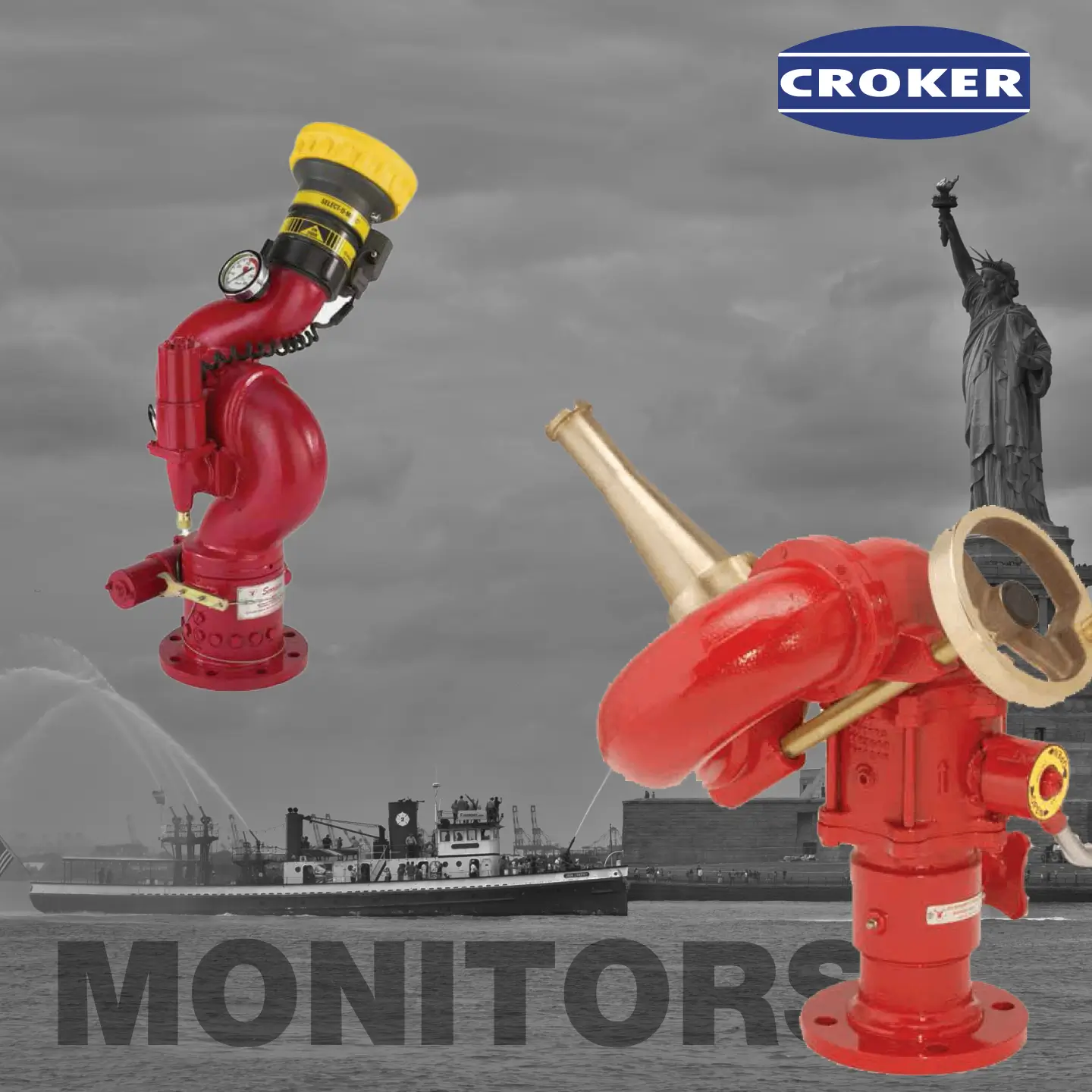 Croker monitor nozzles are available in fixed, portable, and remote-controlled designs. They offer various flow rates and mounting options for long-range firefighting coverage.