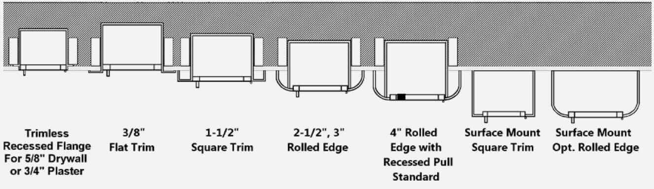 1500 - Recessed 3/8" flat trim, Inside Box: 32-3/4" x 34 3/4" x 5-1/2" 1501 - Semi-recessed 1-1/4" square edge trim, Inside Box: 32-3/4" x 34 3/4" x 5-1/2" 1508 - Surface mount, Inside Box: 35-15/16" x 37-15/16" x 6" 1510 - Recessed 3/8" flat trim, Inside Box: 32-3/4" x 38-3/4" x 5-1/2" 1511 - Semi-recessed 1-1/4" square edge trim, Inside Box: 32-3/4" x 38-3/4" x 5-1/2" 1518 - Surface mount, Inside Box: 35-15/16" x 41-15/16" x 6"?