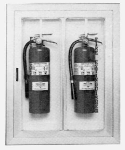 1650 Series Canopy Style cabinets will accommodate a portable fire extinguisher. The extinguisher must be mounted to the back of the tub using a bracket. 1670 Series cabinets are designed to contain two portable fire extinguishers.