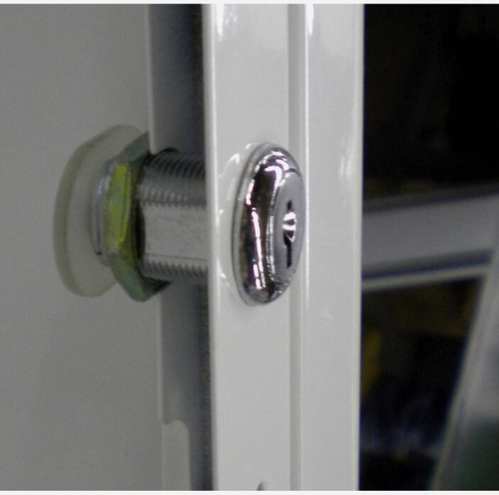 Theft-deterrent feature with keyed cylinder lock available on most cabinets. It can be opened with a sharp pull that breaks the replaceable plastic cam. This deters theft and vandalism which occur from un-locked cabinets and allows quick access to the equipment. Plastic cam is 1-5/8” x 1” x 3/32”. Extra or re-placement cams can be ordered.