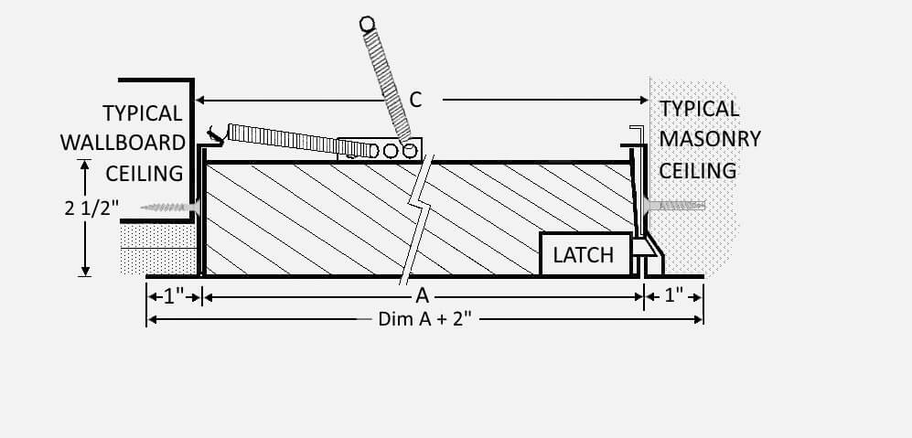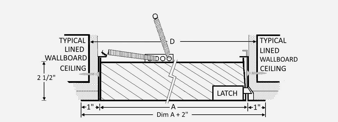 Frame: 16 gauge steel with a 1” flange. Welded-on masonry anchor. Door: 2” thick, insulated 20 gauge steel with continuous hinge. Finish: White powder coat paint. Latch: Universal turn ring and key lock (U). Sizes: Minimum 8”x 8”. Maximum wall 48”x 48”, ceiling 24”x 36”.