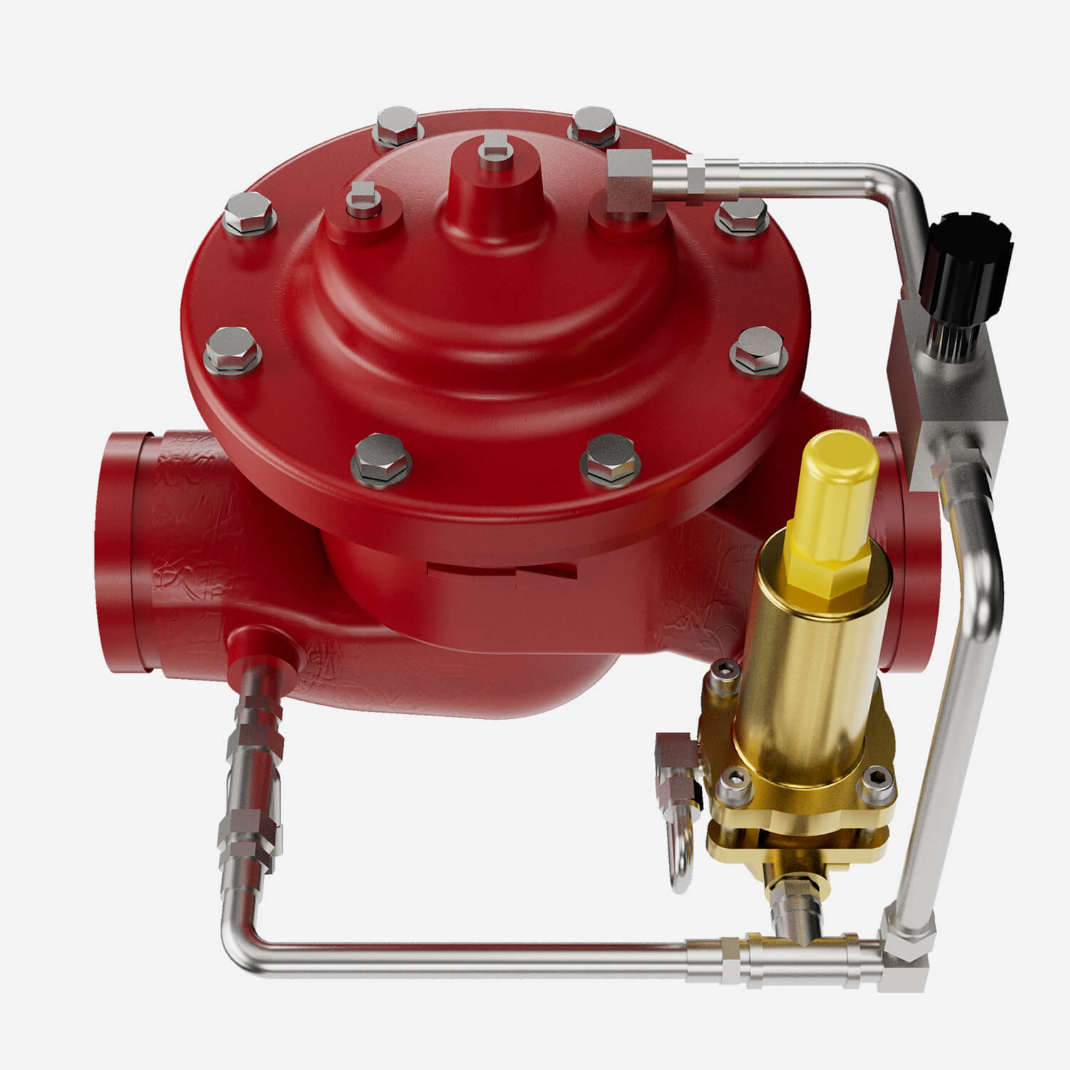 AUTOMATIC CONTROL VALVE is self-acting to achieve a reduced outlet pressure from an unregulated higher inlet pressure. Pilot-operated main valve is not subject to pressure fall off. Body and bonnet made of ductile iron with internal seat, stem, and spring of stainless steel. Available with globe body, either grooved or flanged inlet and outlet. Red RAL3000 Fusion Epoxy Coated interior and exterior. UL 1739 listed in 1-1/2” through 10” sizes. Rated upstream pressure 300 psi max with 15psi-65psi, 35psi-85psi,and 65 psi-165 psi constant downstream pressures.
