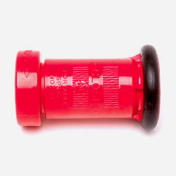 Red polycarbonate plastic fog nozzle with rubber bumper.