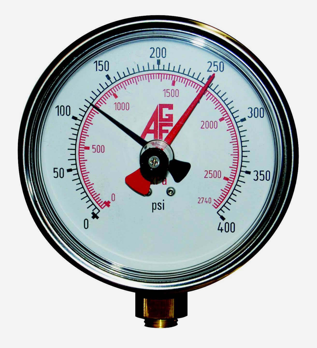 The AGF Model 7550 SMARTGAUGE is a 4" pressure gauge with an integral drag pointer designed to record system pressure spikes caused by Municipal Water Supplies or pumps that are not operating correctly. The Model 7550 can be installed temporarily or permanently to record wet system pressure spikes so Pressure Relief Valves can be sized correctly. On dry systems the Model 7550 can be used to confirm Municipal Water Supply Pressures so dry valves will not be overpowered by system wide pressure increases during periods of low demand. The Model 7550 is also a valuable addition to Hydrostatic Test Assemblies because of its ability to record the highest pressure during system testing.